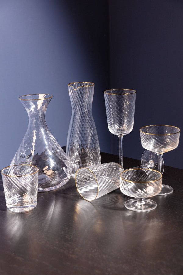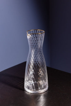 Aster Gold Water Jug by Atticus & Stone. Ribbed glass water jug with gold trim, a classic yet modern addition to any table ware collection.