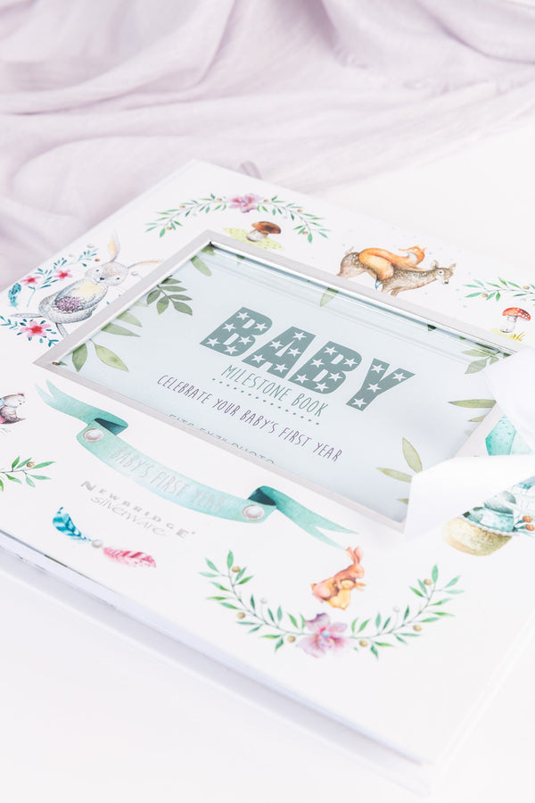 A beautifully illustrated baby milestone book to celebrate your baby's first year, all illustrations created by the Newbridge Silverware design team, fits 5" x 7" photo in cover, storage envelope included, presented in a Newbridge Silverware gift box.