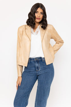 Beige Camilla Jacket by J'aime la Vie. This stunning ladies jacket features an open front design and can be paired with jeans for a casual look or dressed up over a midi dress for a special event.