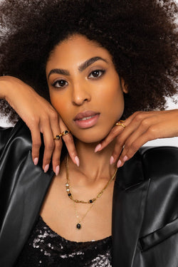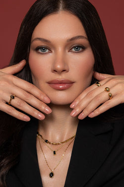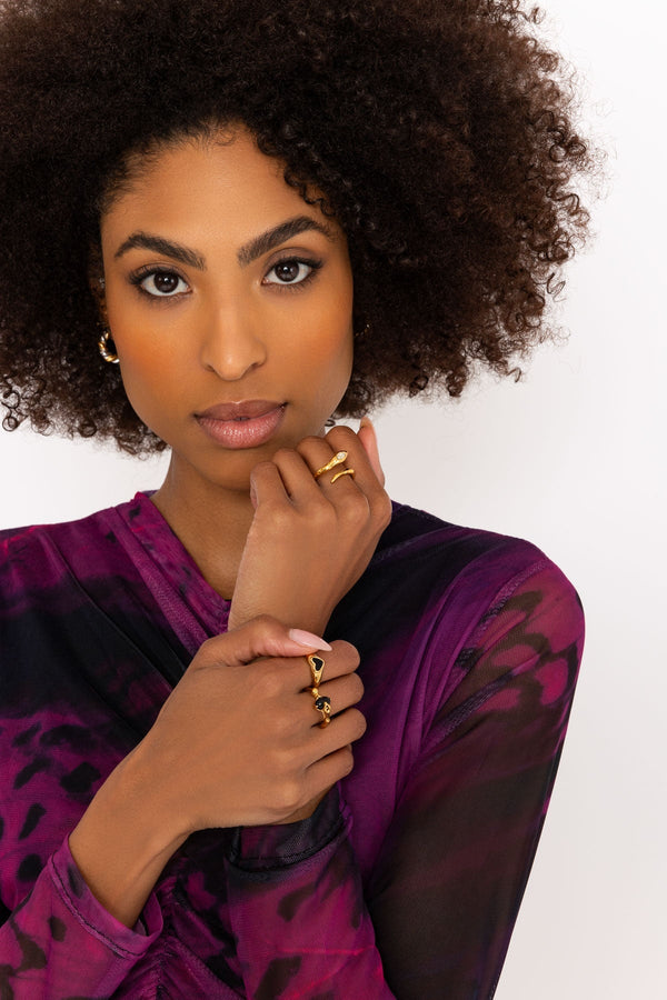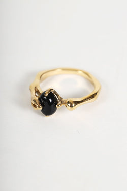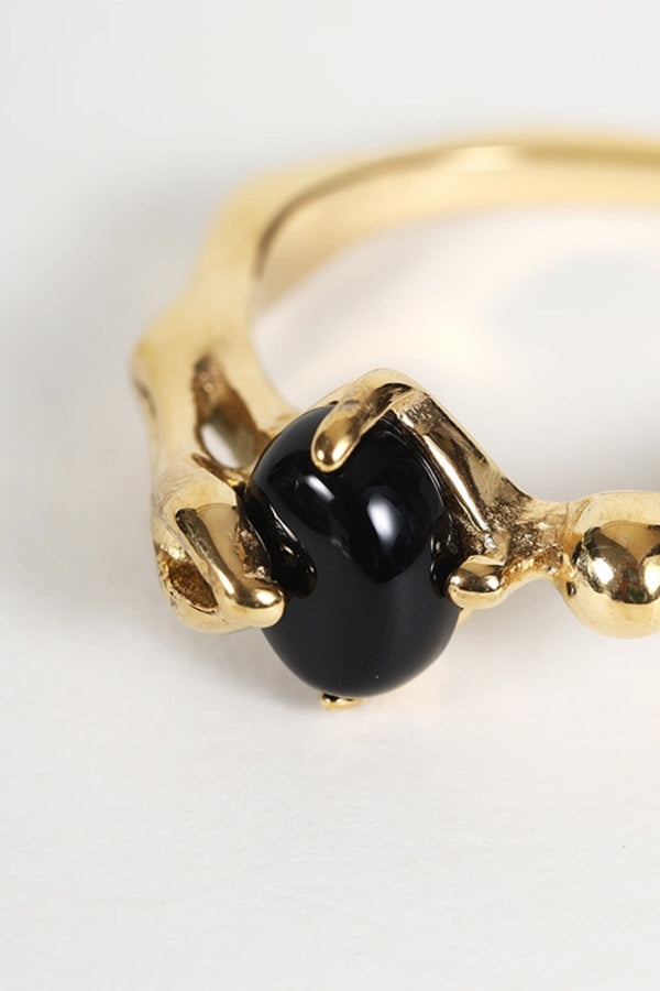 Black Stone Gold Ring - Size 8 by Joularie. This ladies ring features a semi-precious Lapis Lazuli stone. Add a touch of elegance and sophistication to any outfit with this unique and eye-catching gold ring.