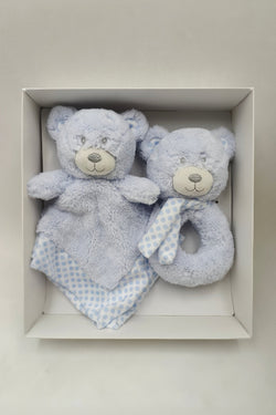 Blue Teddy Comforter & Rattle Gift Box by Carraig Donn Home. The soft and comforting teddy bear design is sure to provide comfort and joy, while the included rattle adds a fun touch for babies to play with.