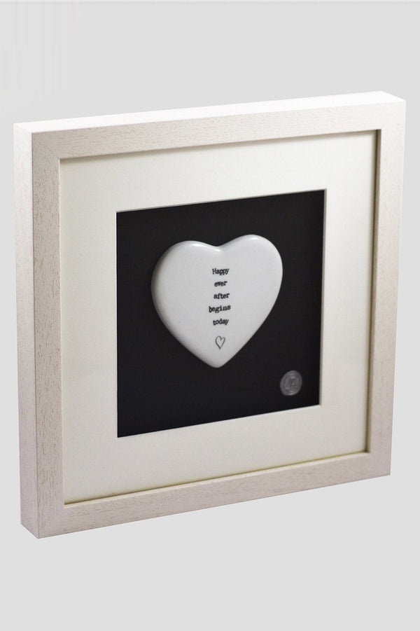 A beautiful piece of our delicate heart-shaped ceramic comes framed in our deep lime white frame and signed with our wax seal in rich silver. Made in Galway, the simple yet striking phrase of "Happy ever after begins today" comes in our simple print press design and accentuated by a heart outline. A perfect engagement or wedding piece for a perfect couple.