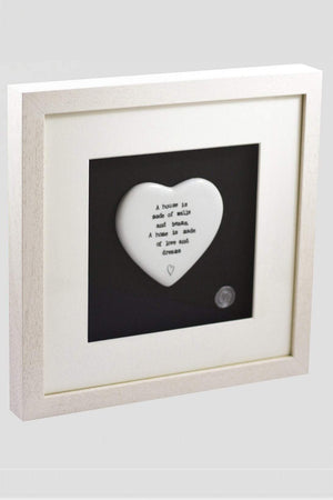 A beautiful piece of our delicate heart-shaped ceramic comes framed in our deep lime white frame and signed with our wax seal in rich silver. Made in Galway, the simple yet striking sentiment of "A house is made of walls and beams, A home is made of love and dreams" comes in our simple print press design and accentuated by a heart outline.