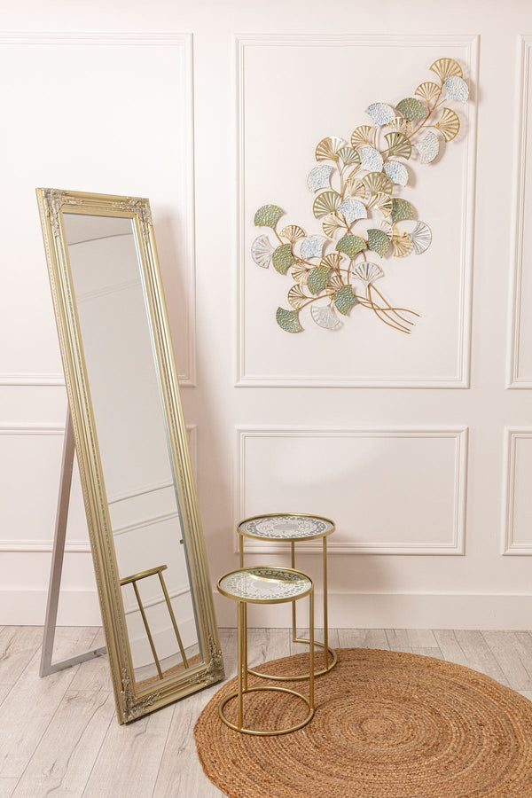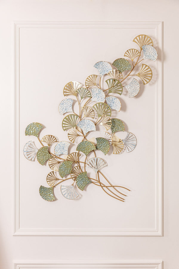 Metal wall décor from Carraig Donn Home. Perfect for a living room or kitchen. With accent colours of sage green, blue and a brushed gold finish this is modern wall art and will bring together a colour scheme in a very modern way.