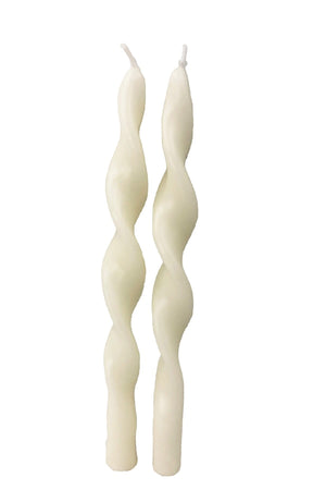 Set of 2 ivory wax dinner candles. The delicate spiral design and classic cream colour will elevate any table scape while providing a long-lasting burn time. Perfect for special events or everyday use.