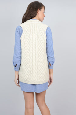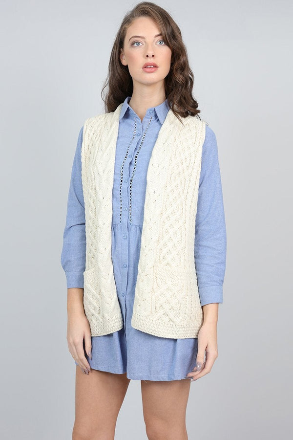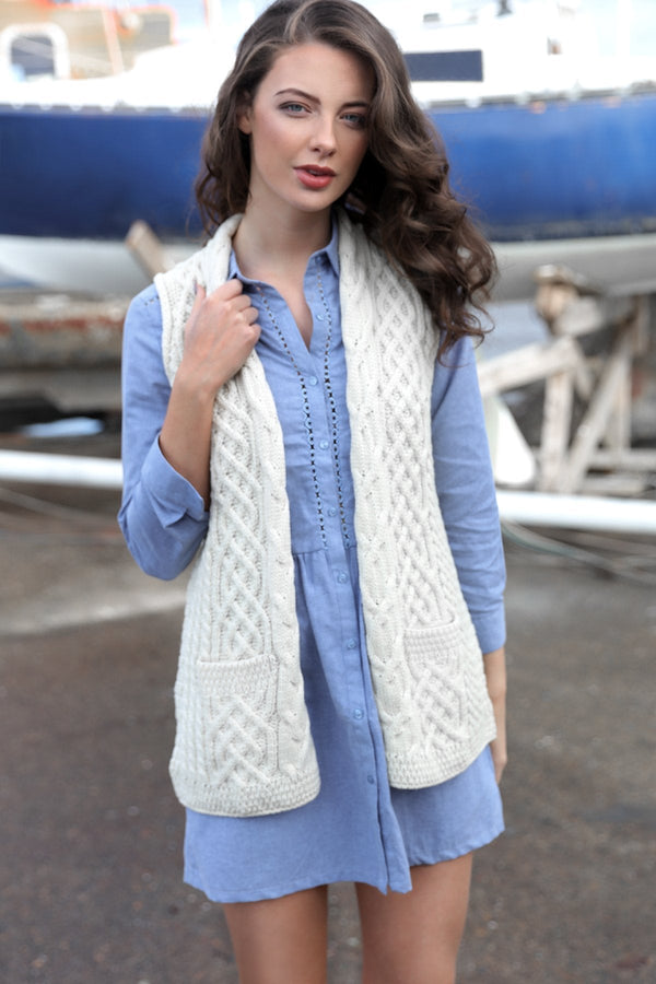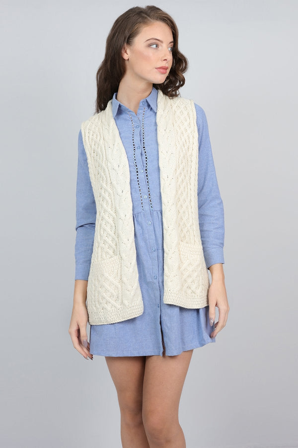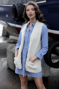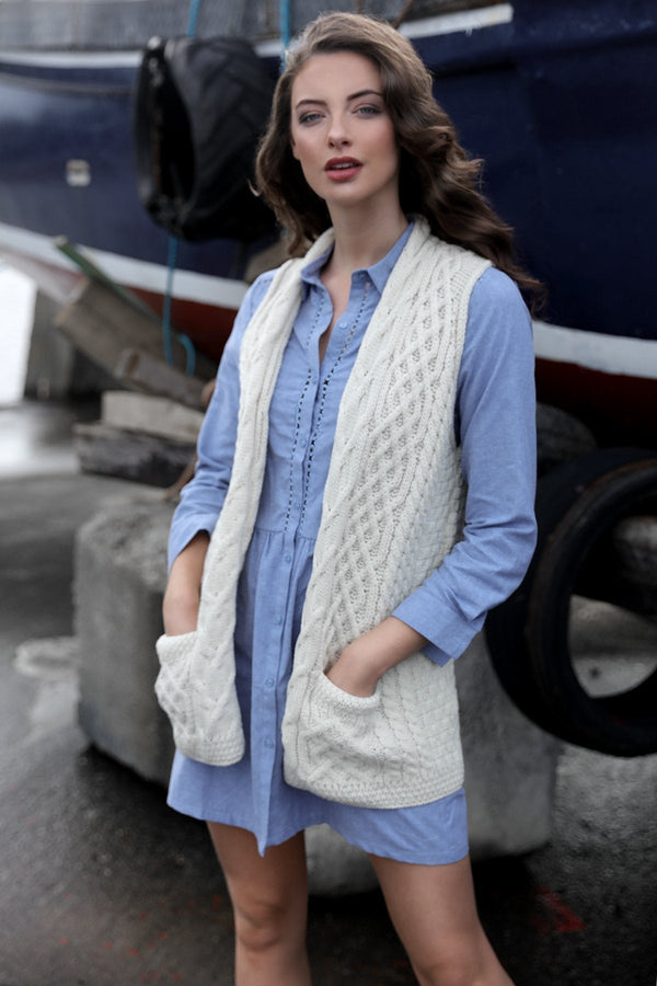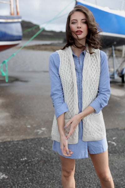 Ladies Celtic gilet from Aran Woollen Mills, designed and knitted from merino wool in Westport, Co.Mayo Ireland.