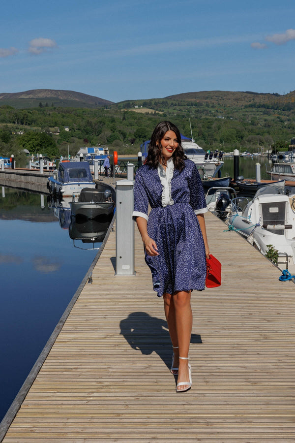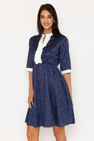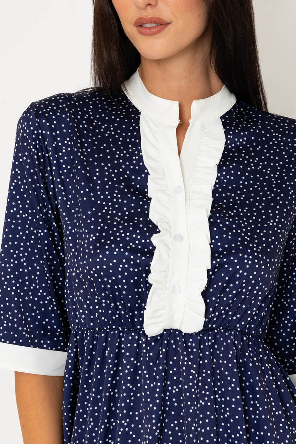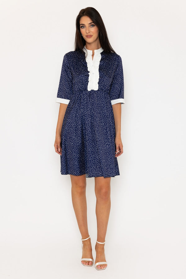Navy & White Suzie Knee Length Dress by Pala D'oro. The polka dot print, 3/4 sleeves, and collarless design create a timeless look, while the ruffle front adds a touch of femininity. Perfect for any occasion.