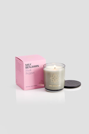 A luxury natural wax candle from Irish Brand Max Benjamin. Uplift your space with the calming and stimulating aroma pink pepper home fragrance