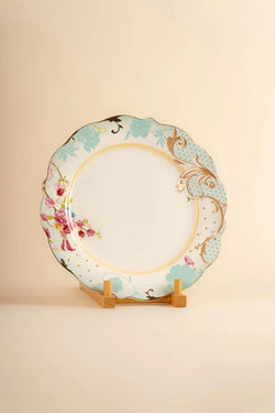 Inspired by a vintage dinner party this elegant blue dinner plate by Rosa Belle exclusive to Carraig Donn has beautiful floral designs in baby blues with a hint of fuchsia with a new design for 2022. The gold trim gives an ornate finish to this classy collection.