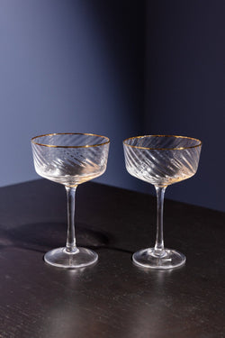 Set of 2 Aster stylish champagne saucers by Atticus & Stone with a gold trim and modern glass cut.