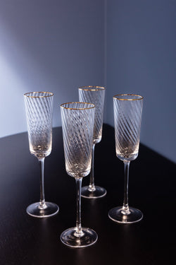 Set of 4 Aster gold trimmed champagne flutes from the Atticus Stone collection of premium tableware.