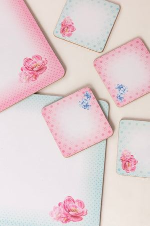 Set of 6 heat resistant cork backed placemats from the Rosa belle collection of tableware at Carraig Donn. 3 of each design in the gift boxed set.