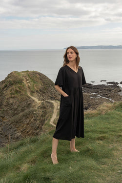 Short Sleeve Linen Blend Smock Midi Dress in Black by Rowen Avenue. Its short sleeves and smock design offer a comfortable and easy to wear fit, making it a basic essential for your vacation.