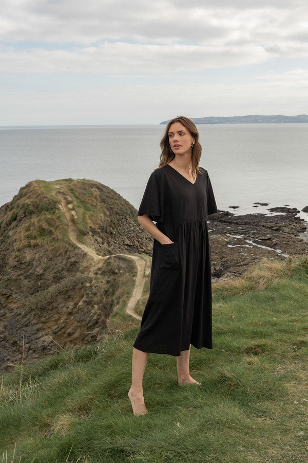 Short Sleeve Linen Blend Smock Midi Dress in Black