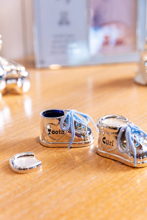 Silver baby boy tooth and curl holder from Carraig Donn Living. Perfect christening gift presented in a beautiful gift box.