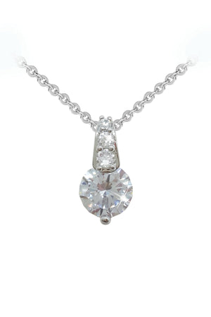 Simple, yet captivating, this stunning pendant will complement any look. Crafted in cool silver, the pendant showcases a single luminous centre stone in a unique single prong setting. Above, a trio of beautiful clear, round crystals line the polished linear bale. Buffed to a brilliant lustre, this perfectly elegant pendant glides freely along a cable chain that secures with a lobster claw clasp and a 2” extension chain.