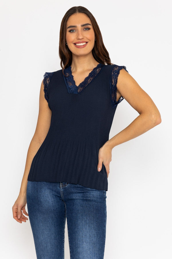 Navy Sleeveless Lace Trim Pleat Top by Pala D'oro. This versatile ladies top is a great basic that can be dressed up or down, making it perfect for layering.