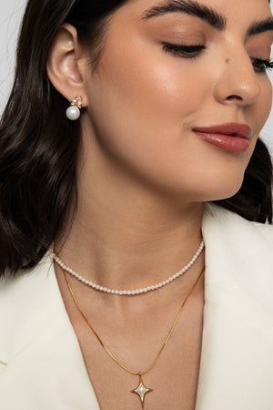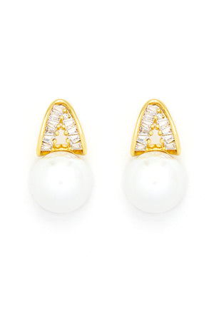 Beautiful faux pearl earrings embellished with CZ stones in baguette cut.