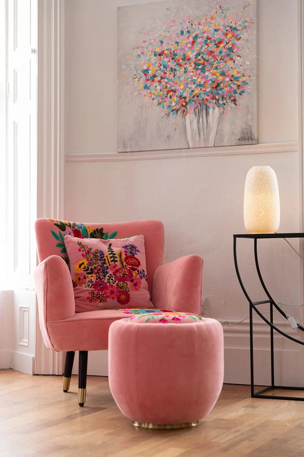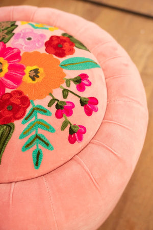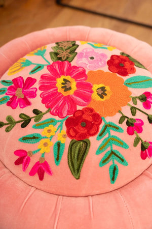 Introduce sophistication into your space with our luxurious Velvet Cassie Pink Floral Embroidered Footstool by Carraig Donn Home. This stool is both functional and aesthetically pleasing. Matching chair available.